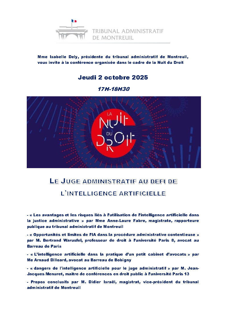 Mme Isabelle Dely, présidente du tribunal administratif de Montreuil, vous invite à la conférence organisée dans le cadre de la Nuit du Droit édition 2025 le Jeudi 2 octobre 2025 de17H-18H30
